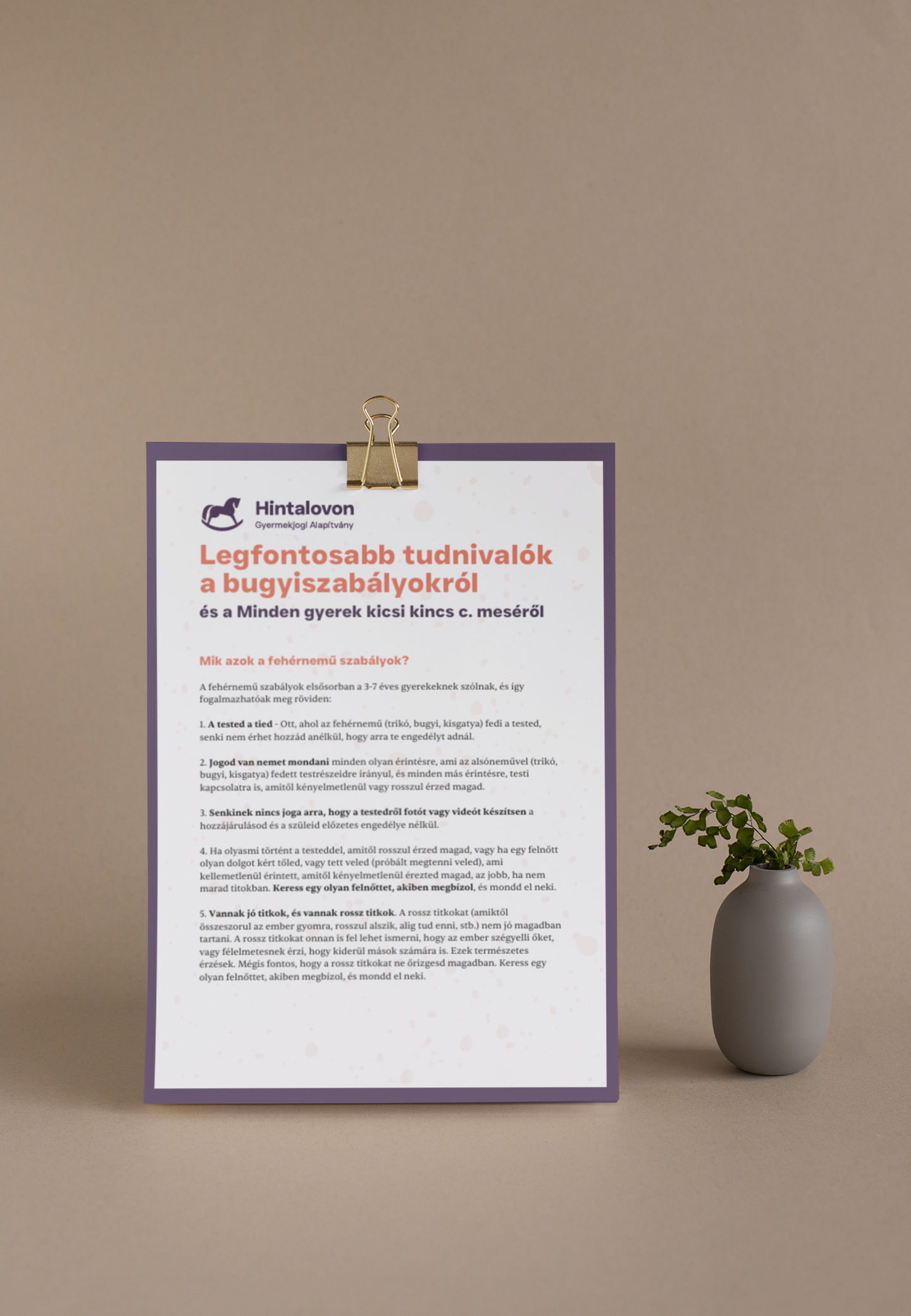 Ahogy ma a dohányzásellenes kampány részét képezik a dobozokon használt elrettentő feliratok, úgy használták a svédek a gyereknevelés mindennapos kellékeinek csomagolását a szülőkkel való kommunikációra. A pelenkáktól a babatáplálási termékekig mindenhol szerepeltek a „ne rázd!”, „ne pofozd meg!” és hasonló üzenetek, és mellettük segítségként egy ingyenesen hívható telefonszám. Az ilyen mélyen berögzült szokások terén, mint a nevelési célzatú tenyeres, még nagy energiák mellett is lassú a változás. Két generációnak kellett felnőni a svédeknél is ahhoz, hogy teljesen kikopjon a tasli a szülők eszköztárából. Magyarországon is fel kellene nőnie egy olyan generációnak, amelyet nem ütnek meg.